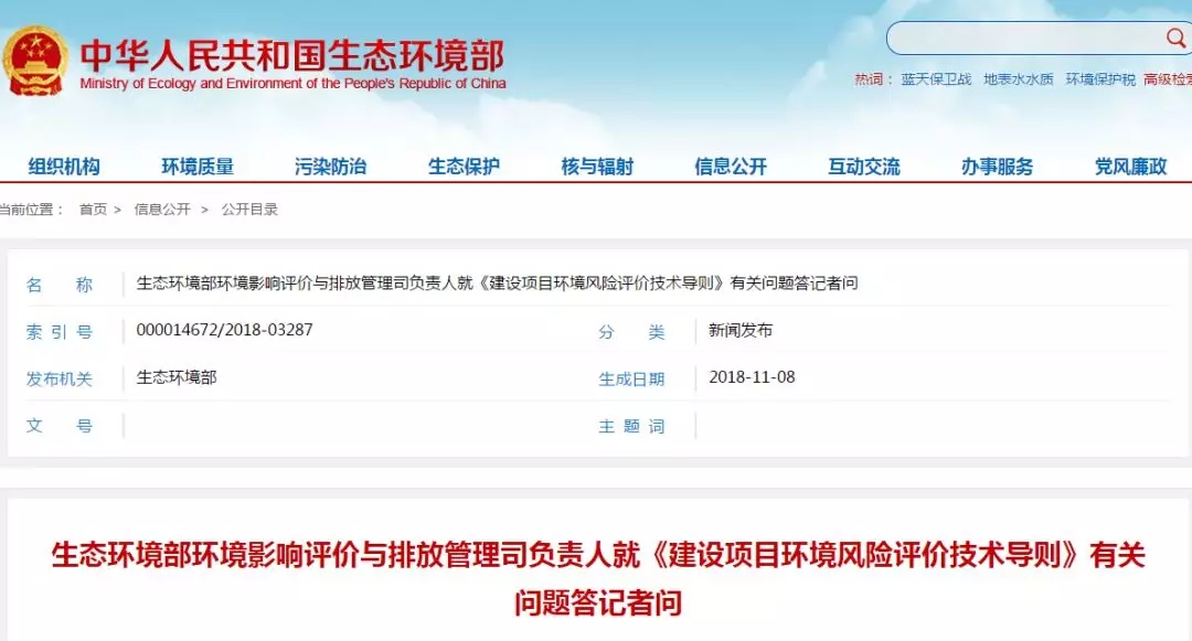 生態(tài)環(huán)境部日前印發(fā)了《建設(shè)項(xiàng)目環(huán)境風(fēng)險(xiǎn)評(píng)價(jià)技術(shù)導(dǎo)則》(HJ169-2018)(以下簡(jiǎn)稱《風(fēng)險(xiǎn)導(dǎo)則》),生態(tài)環(huán)境部環(huán)境影響評(píng)價(jià)與排放管理司負(fù)責(zé)人就《風(fēng)險(xiǎn)導(dǎo)則》修訂的背景、思路及內(nèi)容等有關(guān)問(wèn)題回答了記者的提問(wèn)。